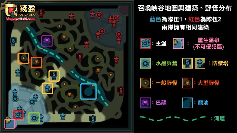 - 野怪:一般野怪分大型與小型兩種,擊殺後可以取得經驗和金錢。部分大型野怪會提供額外的增益效果。